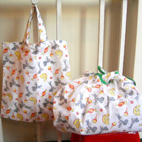 お客さんが以前nicoでお買い上げ頂いた物で作品を作って持って来てくれました。 とってもかわいい手提げバッグとふろしき風の袋。