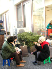 今日はお雑煮を振る舞いながら営業しました。 nico専属鍋番長(右奥)とお客さん