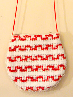 ろうけつ染めの布に赤い布がチクチク縫い付けられて模様になっています。