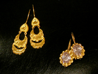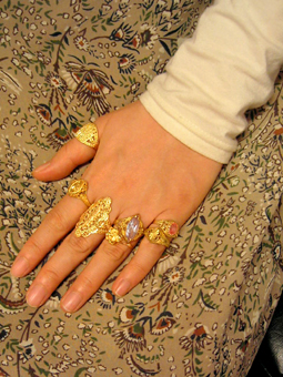 ウイグル族の女性が身につけている金色のアクセサリーです。